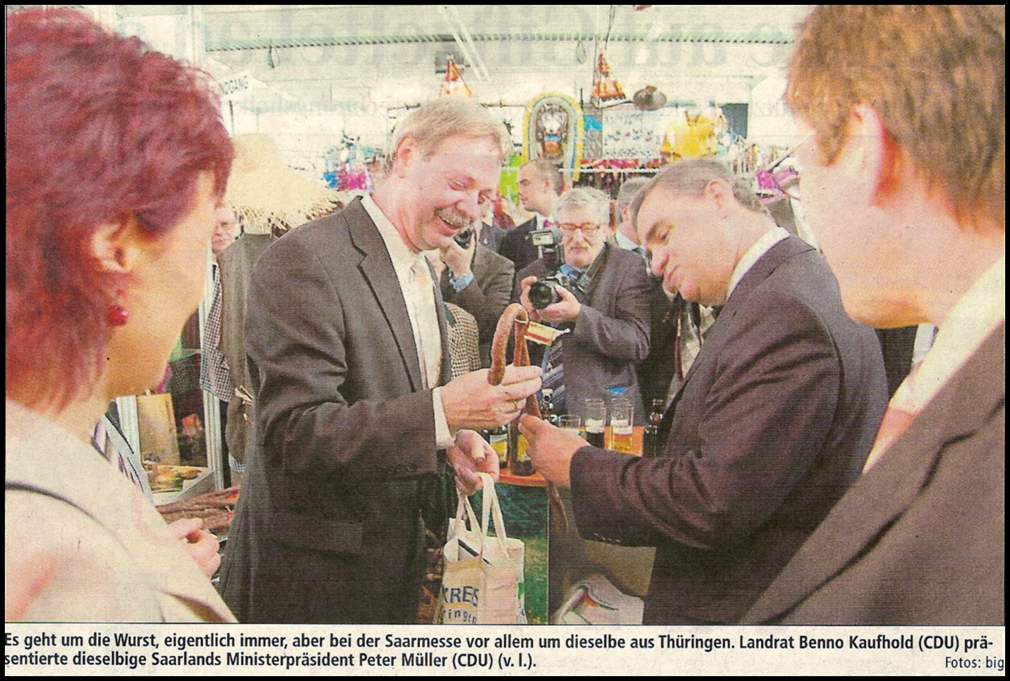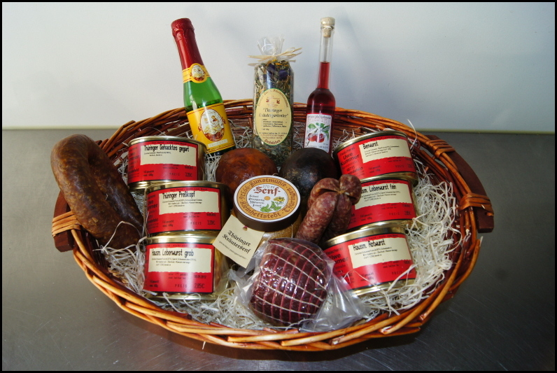 Wir stellen nach Ihren Wünschen und Preisvorstellungen Präsentkörbe zusammen mit echter Thüringer Wurst aus eigener Herstellung und weiteren Thüringer Produkten wie: Senfspezialitäten aus Kleinhettstedt, Obstbrände und Likör der Fahner Landbrennerei Döllstädt, Tee aus der Kräutermanufaktur in Nägelstedt oder Fleischersekt.