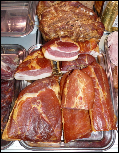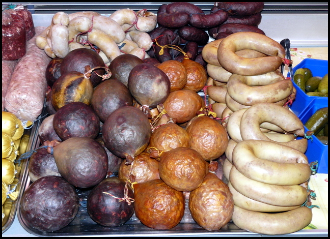 Hausmacher Rotwurst als Ring (Kranzdarm), in der Schweinekrause oder Blase, Hausmacher Presskopf in der Schweineblase |