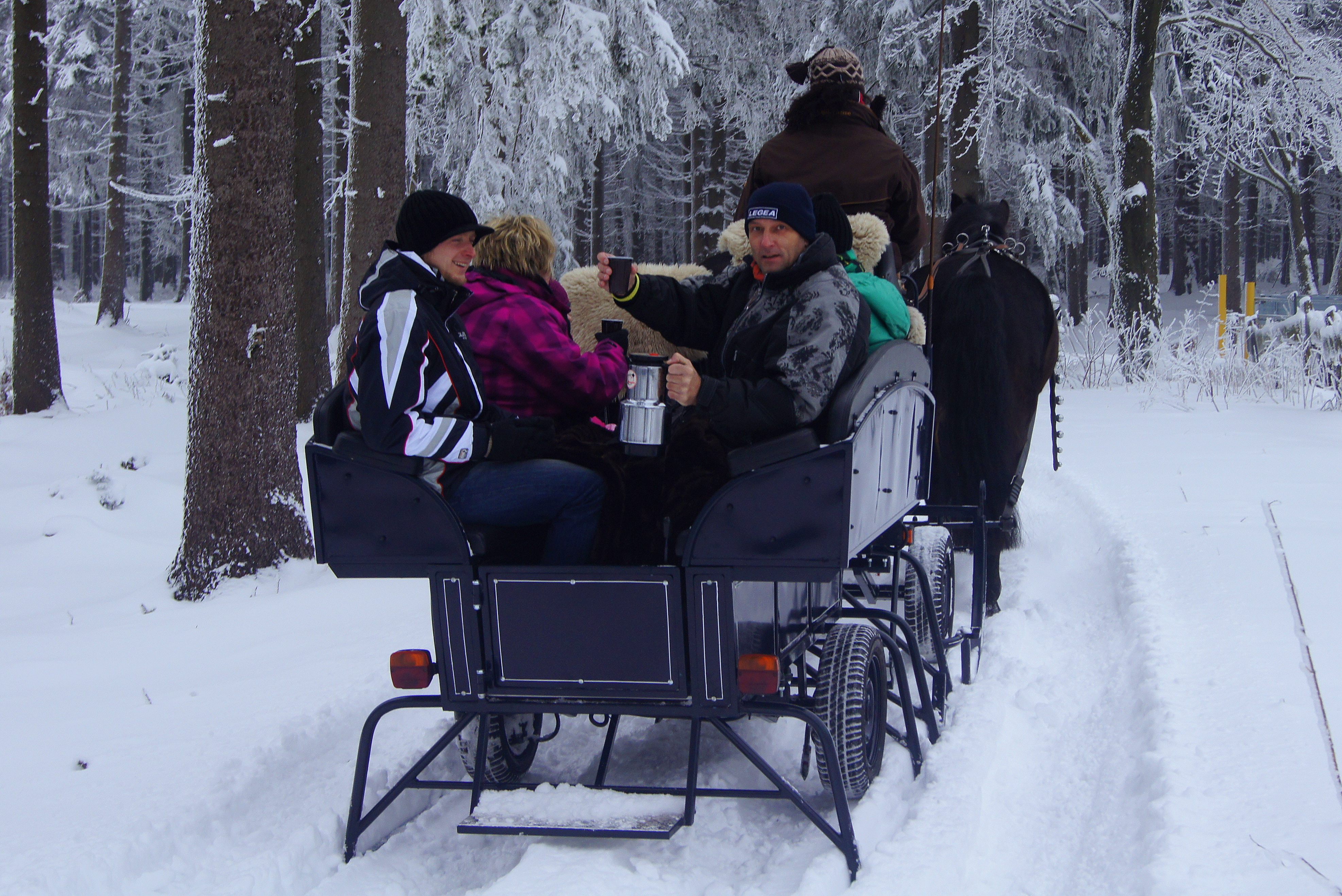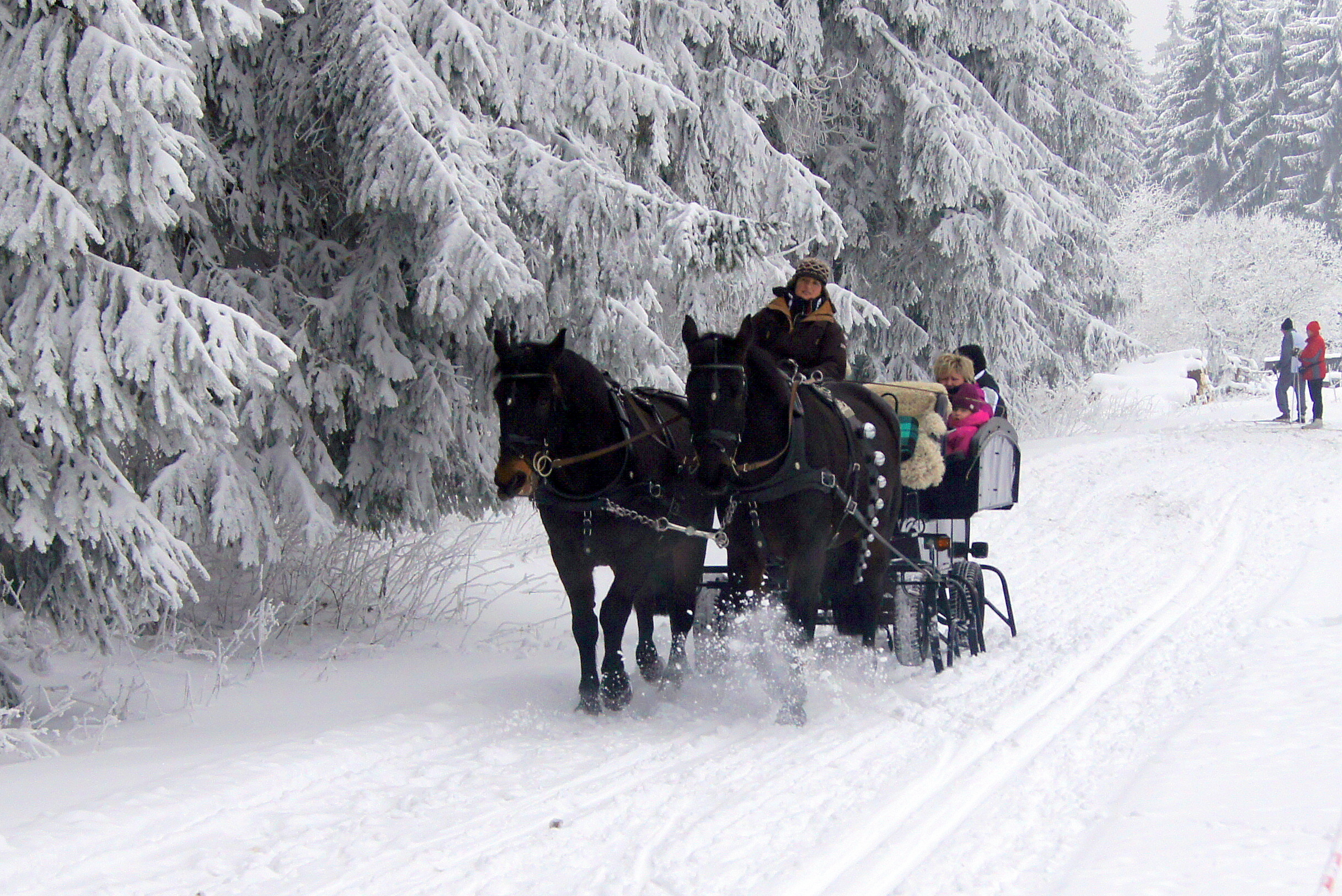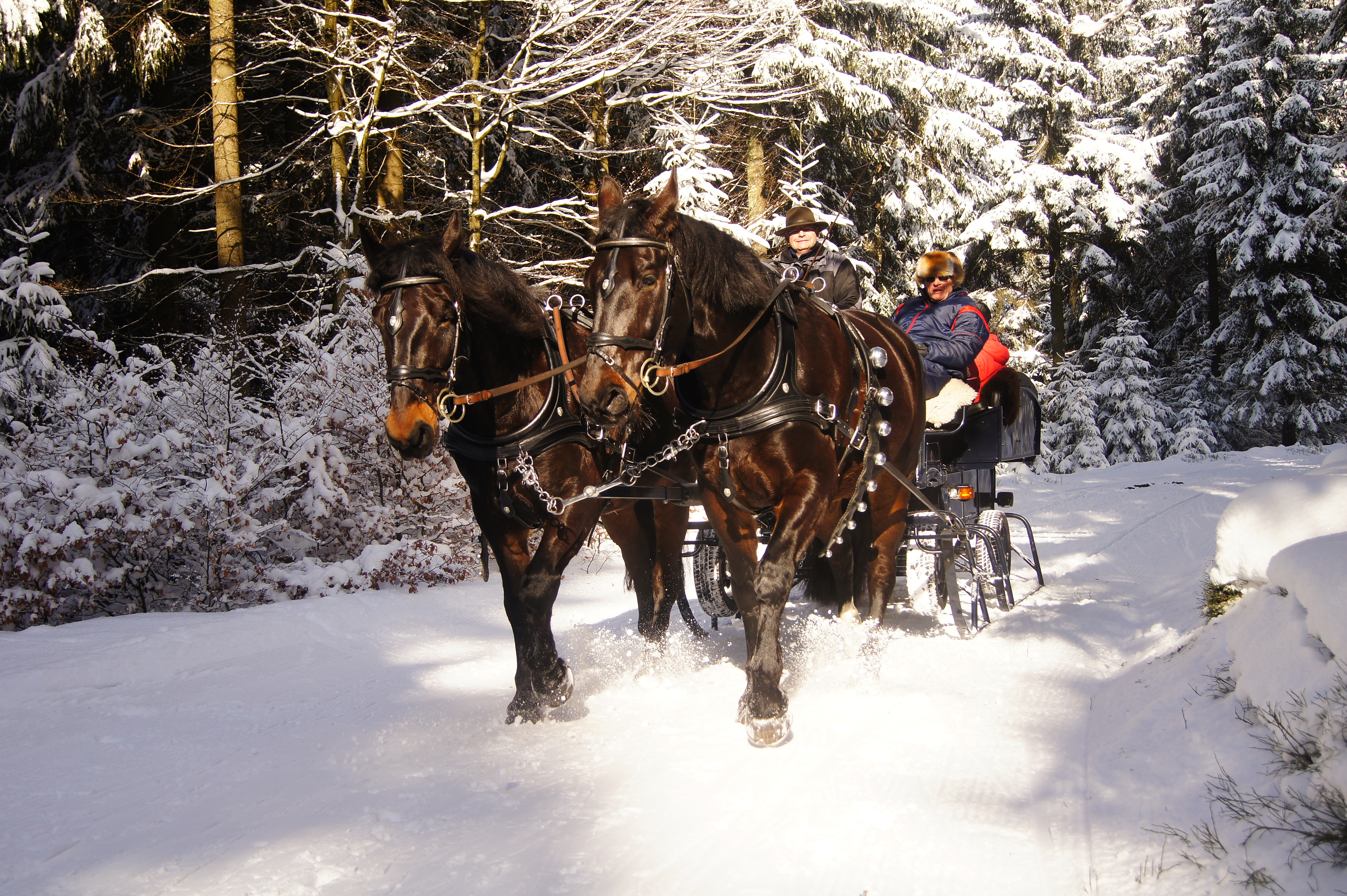 Sollten die Schneeverhältnisse keine Schlittenfahrten zulassen, fahren wir Sie auch gerne mit der Kutsche durch den leicht verschneiten Winterwald.